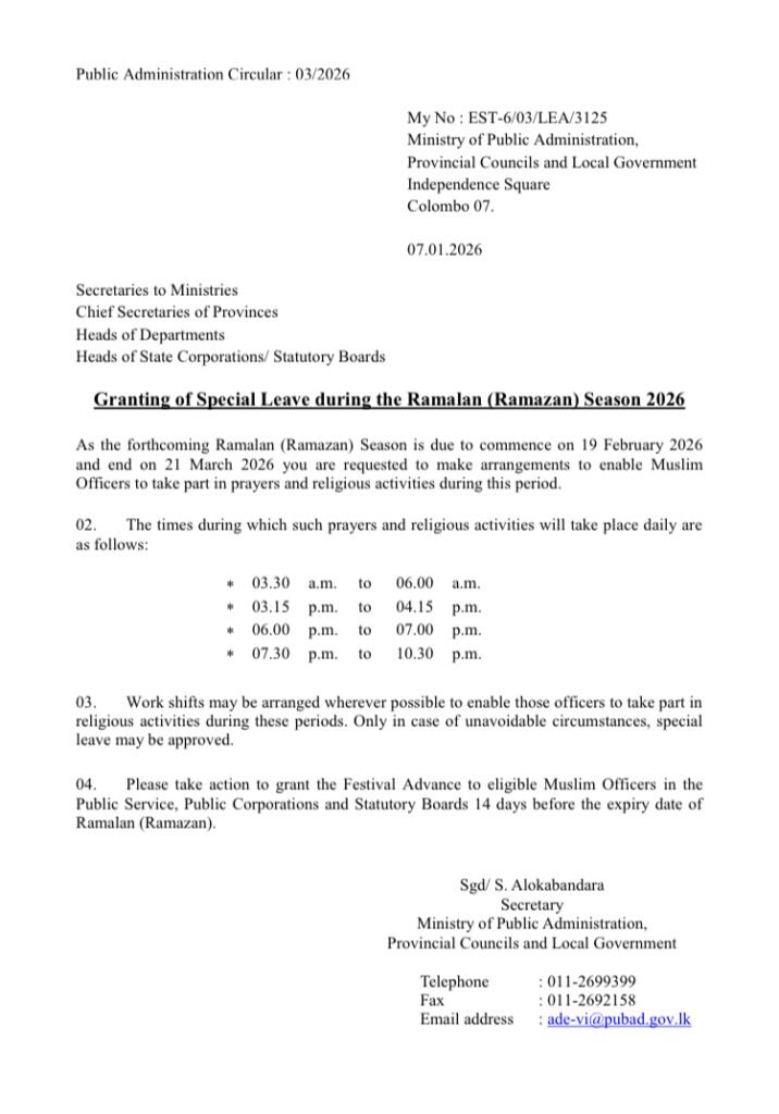 ரமழான் காலத்தில் அரச உத்தியோகத்தர்கள் மத வழிபாடுகளில் ஈடுபடுவதற்கான விசேட சுற்றறிக்கை வெளியிடப்பட்டுள்ளது.