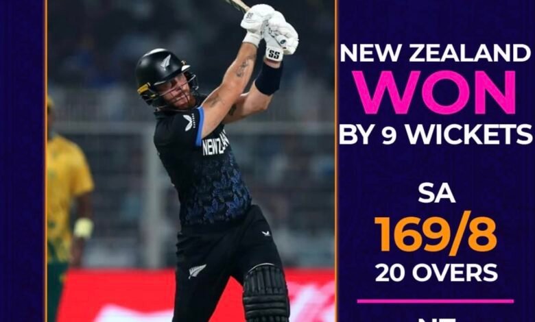 170 ஓட்டங்கள் என்ற வெற்றி இலக்கை நோக்கிப் பதிலுக்குத் துடுப்பெடுத்தாடிய நியூசிலாந்து அணி, ஆரம்பம் முதலே அதிரடி ஆட்டத்தை வெளிப்படுத்தியது. தென்னாபிரிக்கப் பந்துவீச்சாளர்களைத் திணறடித்த ஆரம்பத் துடுப்பாட்ட வீரர்களான டிம் சீஃபர்ட் மற்றும் பின் ஆலன் ஆகியோர் ருத்ரதாண்டவம் ஆடினர். மைதானத்தின் நாலாபுறமும் சிக்ஸர்களைப் பறக்கவிட்டனர், டிம் சீஃபர்ட் 58 ஓட்டங்களுக்கு ஆட்டமிழந்த நிலையில், வெறும் 33 பந்துகளில் சதம் விளாசி, டி20 உலகக்கிண்ண வரலாற்றில் அதிவேகச் சதம் என்ற மாபெரும் சாதனையைப் பின் ஆலன் படைத்தார்.